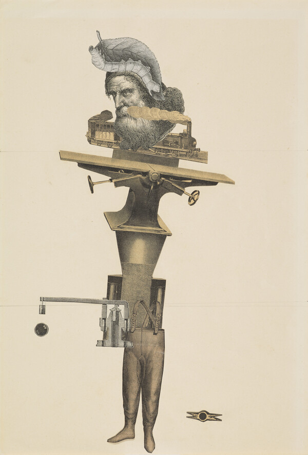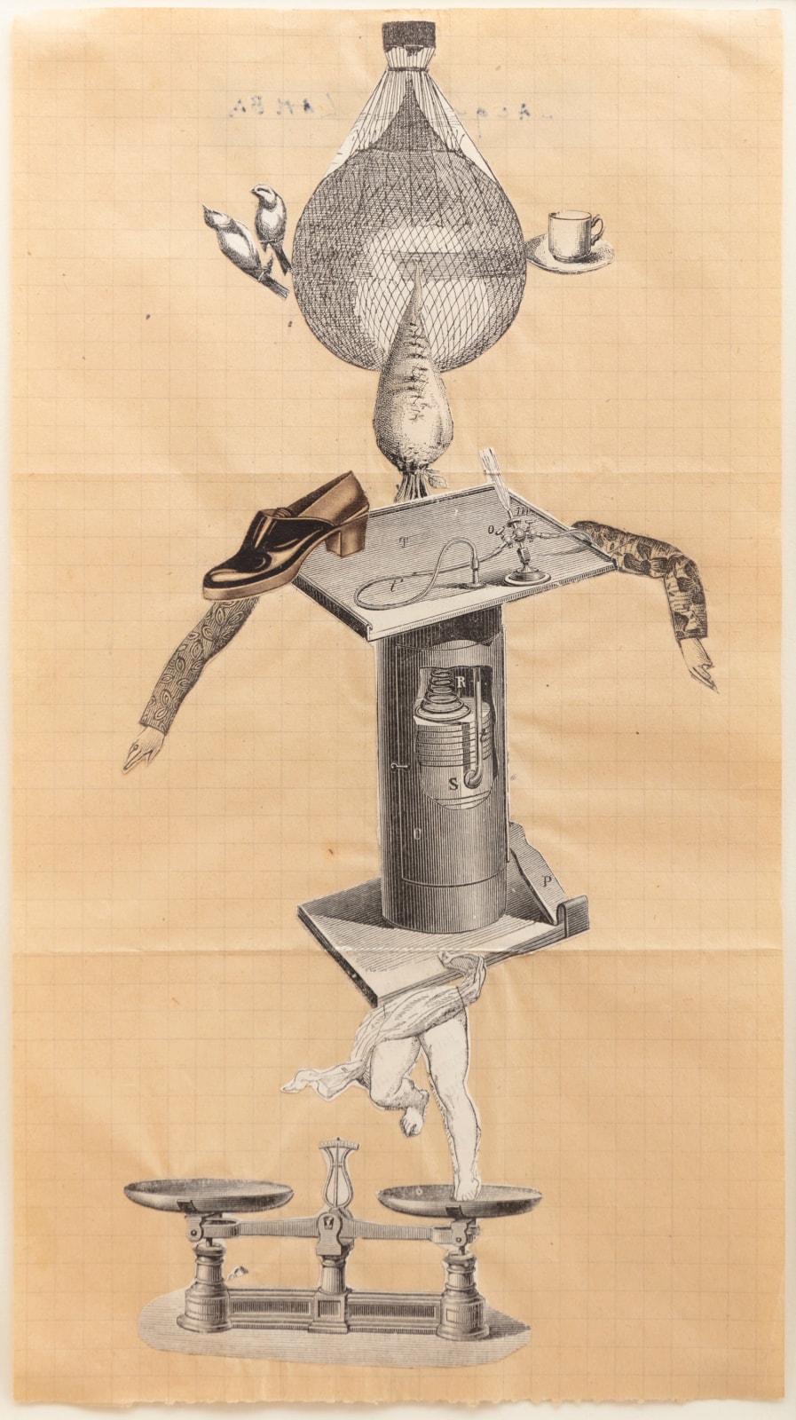 Il collage mostra una composizione a sezioni, dove la testa, il corpo, le gambe e gli altri elementi si susseguono in modo inaspettato, bizzarro, del tutto illogico e libero.