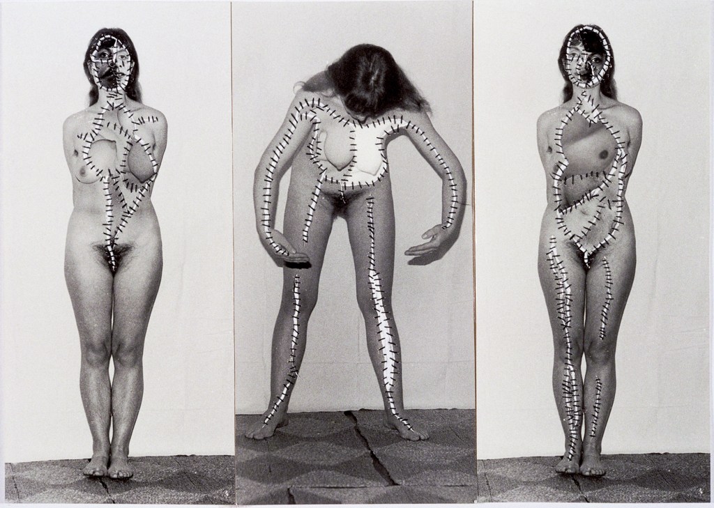 I frammenti delle fotografie vengono strappati, separati e poi ricuciti con ago e filo nero. Un gesto carico di significato: il cucire, attività storicamente associata al ruolo femminile, diventa nelle sue mani un atto critico e sovversivo.
