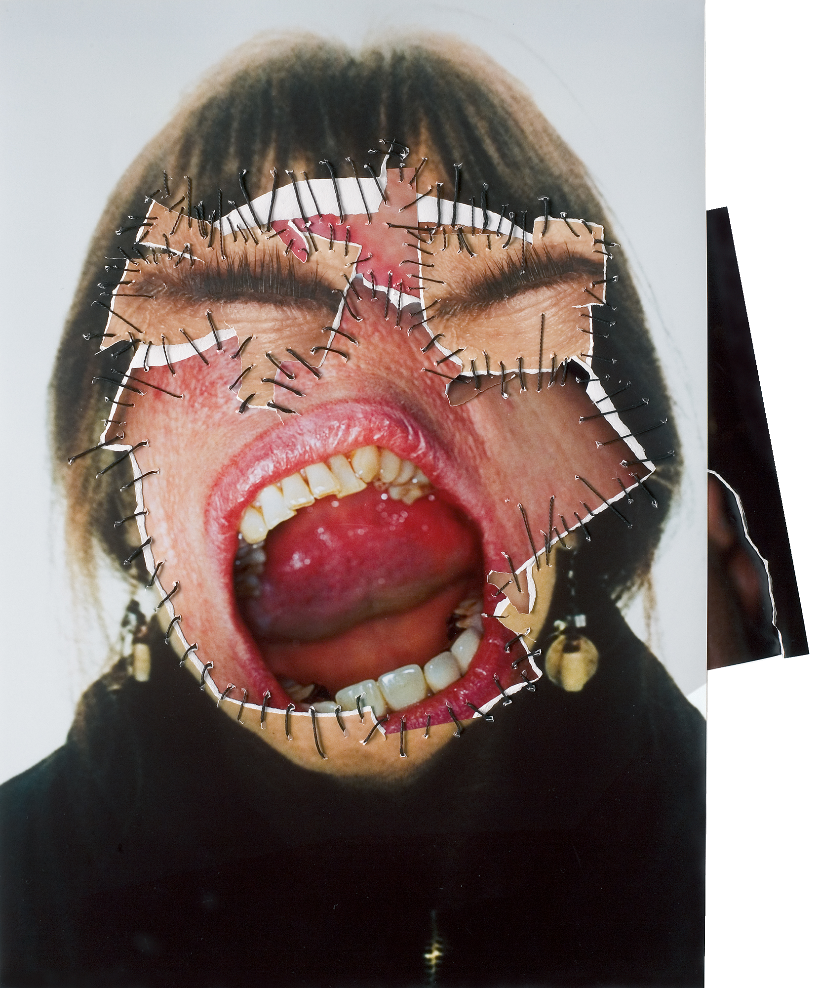 I frammenti delle fotografie vengono strappati, separati e poi ricuciti con ago e filo nero. Un gesto carico di significato: il cucire, attività storicamente associata al ruolo femminile, diventa nelle sue mani un atto critico e sovversivo.